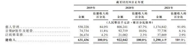 招股書顯示,2021年藝人管理收入為11.75億元人民幣,是2019年該項業務收入的2.2倍。而2019-2021年的三年之中,藝人管理板塊的收入占比由84.0%,一路攀升至87.7%、91.0%。