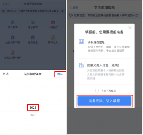 進入申報界面后,“選擇扣除年度”設為2022年,點擊“確認”后,系統會提示需要提前準備的資料,納稅人仔細閱讀后,點擊“準備完畢,進入填報”。