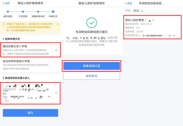 如果納稅人需要在每月發放工資薪金時享受專項附加扣除,需要選擇“通過扣繳義務人申報”,并核實扣繳義務人信息是否準確。選擇完成后,點擊“提交”,即完成3歲以下嬰幼兒照護專項附加扣除填報流程,系統將彈出“專項附加扣除信息已提交”的提示。納稅人可以點擊“查看填報記錄”查看已經申報的專項附加扣除信息。