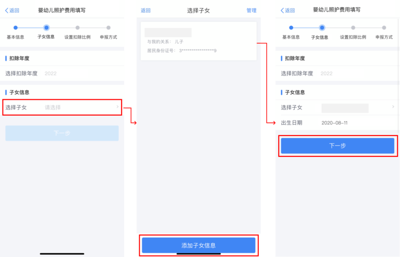 納稅人選擇子女后,將回到“子女信息”界面,并顯示子女的姓名與出生日期,子女信息確認無誤后,點擊“下一步”。