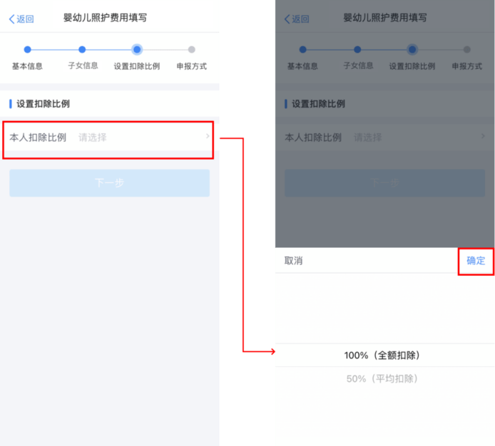 完成子女信息填寫后,納稅人根據實際情況在“本人扣除比例”中選擇100%(全額扣除)或50%(平均扣除)其中一種。選擇完成并確定后,點擊“下一步”。