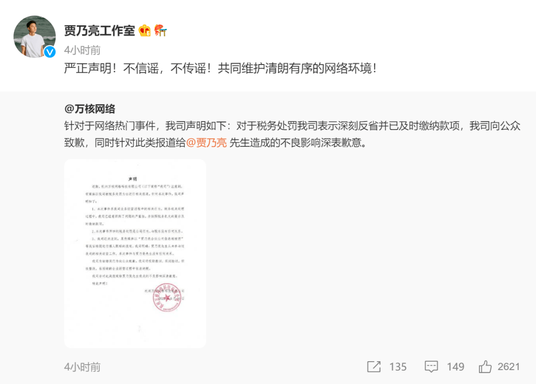 杭州萬核網絡科技有限公司發聲明回應偷逃稅被罰,表示對于稅務處罰深刻反省并已及時繳納款項,明確稱賈乃亮從未參與該公司運營。